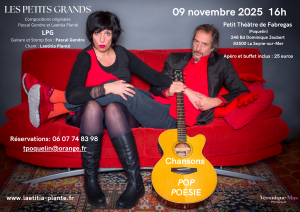 Laetitia Planté, chanteuse, comédienne, coach vocal (Les Pétroleuses, Les Sœurs Jacques et en solo avec Eric Méridiano, pianiste depuis 10 ans) et Pascal Gendre, guitariste, bassiste (No Smoking, P-troll….)