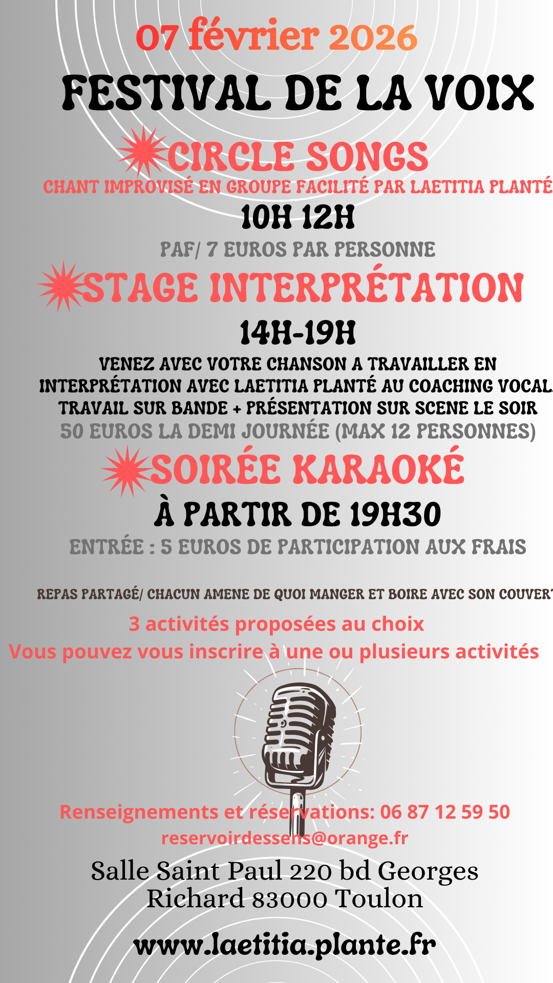 2026 commence avec ses nouvelles énergies, celles du renouveau où nous faisons infuser nos plus secrètes espérances. Je vous invite à partager notre amour du chant avec une journée exceptionnelle: lancement d’un projet de Circle Songs, chant improvisé, que je vais commencer à ritualiser mensuellement à Toulon et une demi journée de stage  » interprétation » pour celles et ceux qui souhaitent chanter en solo avec des conseils techniques et des cadres de jeu permettant une expression libre, authentique et audacieuse. Pour finir avec un karaoké sur scène en soirée. Belle année 2026.