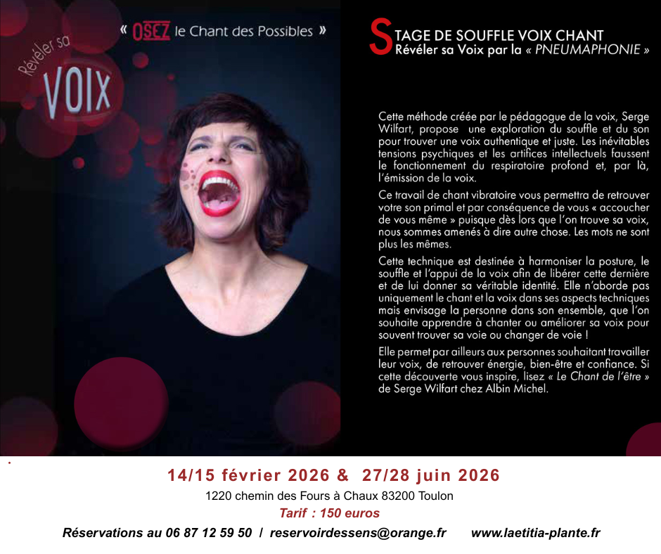 Laetitia Planté, chanteuse, comédienne, professeur de chant et de théâtre, propose des stages ayant pour base la méthode de la « Pneumaphonie » à laquelle elle a été formée. Cette méthode créée par le pédagogue de la voix Serge Wilfart propose une exploration du souffle et du son pour trouver une voix authentique et juste. Les inévitables tensions psychiques et les artifices intellectuels faussent le fonctionnement du respiratoire profond et, par là, l’émission de la voix. Ce travail de chant vibratoire vous permettra de retrouver votre son primal et par conséquence de vous « accoucher de vous même » puisque dès lors que l’on trouve sa voix, nous sommes amenés à dire autre chose. Les mots ne sont plus les mêmes. Cette technique est destinée à harmoniser la posture, le souffle et l’appui de la voix afin de libérer cette dernière et de lui donner sa véritable identité. Elle n’aborde pas uniquement le chant et la voix dans ses aspects techniques mais envisage la personne dans son ensemble, que l’on souhaite apprendre à chanter ou améliorer sa voix. Elle permet par ailleurs aux personnes souhaitant travailler leur voix, de retrouver énergie, bien-être et confiance. Si cette découverte vous inspire, lisez « le Chant de l’être » de Serge Wilfart chez Albin Michel.
